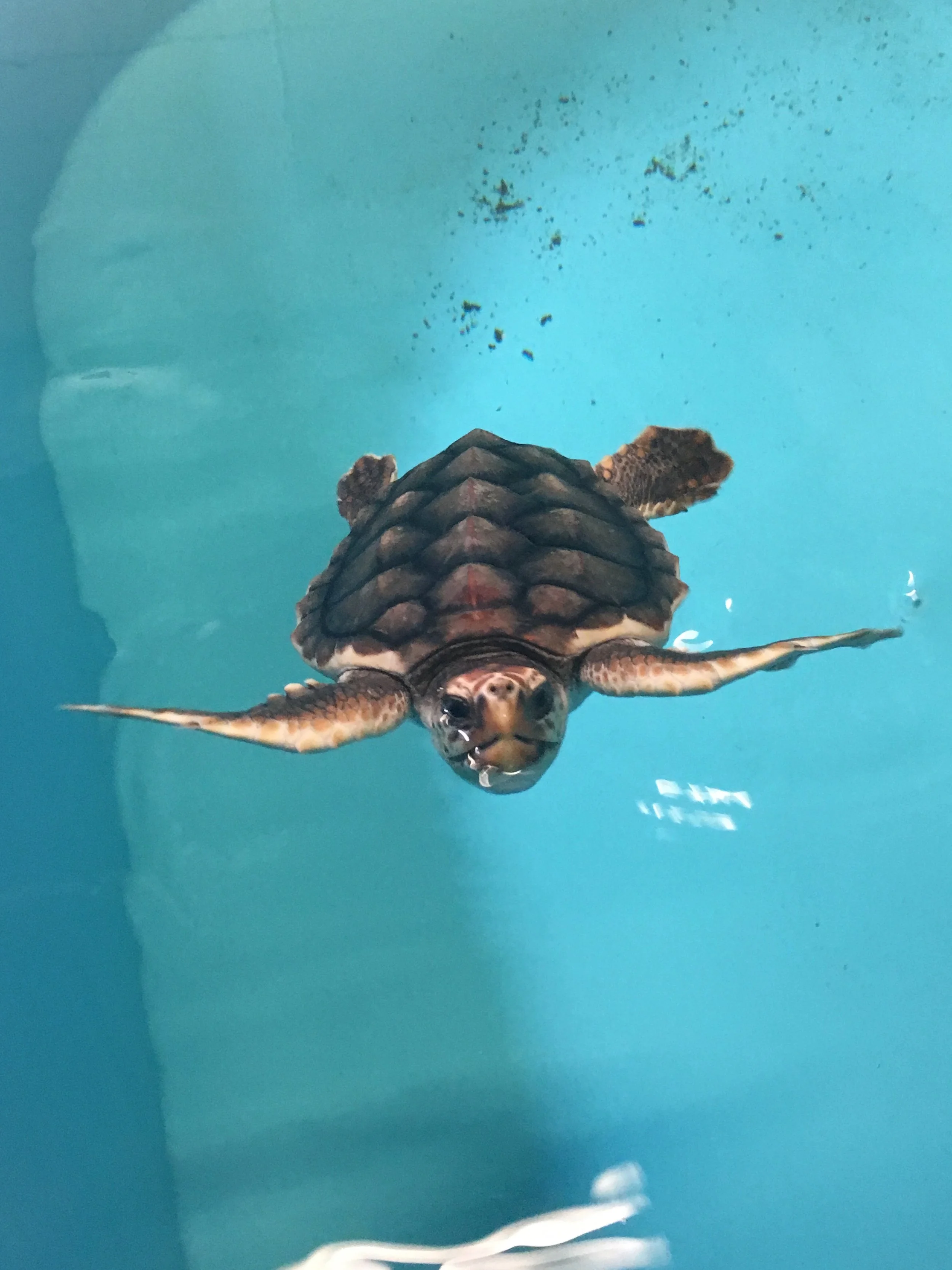 Out of 1,700 sick or injured sea turtles admitted to rehabilitation centers in Florida over 18 years, fewer than a third were released back into the wild. (Baker 2015) Most of the rest died while in captivity, usually during the first few weeks. Individual turtles can be difficult to monitor in the wild, given their solitary nature, vast migrations, and the complexity in designing tracking devices that don’t alter or hinder behavior. As such, it’s unclear how many rehabilitated turtles manage to rejoin the breeding population. Another factor to weigh is animal stress while in captivity. Loftin (1985) writes: “It is possible…to hold that for wild animals the right to liberty is more fundamental than the right to life, and that therefore animal hospitals violate the right to liberty by confining animals in order to treat them.” Turtles are stoic animals, and it’s difficult to tell if they are stressed or in pain. Though federal and state regulations dictate appropriate tank size and depth, lighting, food, and other factors to provide turtles with an environment that is as stress-free as possible, no tank could ever replace the ocean.